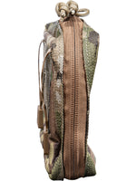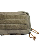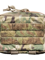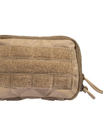 - The front of the pouch features modular webbing and loop material for attaching name tapes or patches