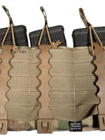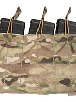 Holds three 30-round 5.56 magazines in a flat configuration. The open-top design features bungee retention and attaches to modular webbing with three long MALICE CLIPS® (included).