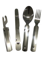 Can/bottle opener acts as a sleeve to neatly hold all of the utensils