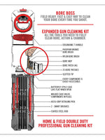 Home and field double duty, single calibre specialized gun cleaning kits. Kits include the bore boss for a quick clean any time you shoot your gun, and an expanded gun cleaning kit with all the tools you need to fully clean bore, action and chamber.