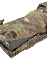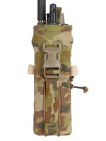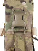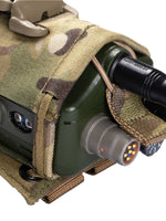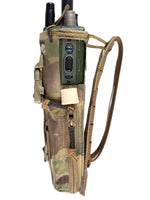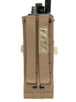 This pouch has been designed to securely hold an AN/PRC-152 Multiband Handheld Radio, with or without GPS module. The pouch has a drop-down feature for quick access to the screen and control panel of the radio without removing the radio. The zip at the bottom allows you to change out the battery quickly without having to disconnect any cables and head-sets.
