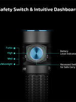 Safety Switch and Intuitive Dashboard: Recessed switch for safe carry, with a sleek dashboard displaying brightness and power levels at a glance.