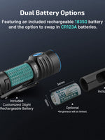 Flexible Power Sources: Powered by the included rechargeable 18350 battery, with the flexibility to use a single-use CR123A battery for added convenience (with limited brightness).