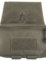 The front of the pouch features a zippered pocket for storage of smaller or flat items. Dual zippers allow the pouch to fold down to clear your platform allowing easier access Velcro loop is sewn internally front and back to allow for the attachment of the Velcro hook backed elastic loop organiser panels. They are sewn into segments with two widths of elastic to stow medical gear, batteries, pens, cables, flashlights etc. Wide elastic sewn to the bottom of the pouch can stow items required in a hurry, i.e. a tourniquet, door charge or similar sized items.