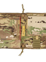 Externally, the OP Notebook has a covered space for up to 6 pens or similar-sized objects. Internally, the left flap securely holds and protects an a5 notebook from the elements, with an added zippered pocket on the notebook flap. The right flap holds a PVC window, sized for small maps, GRG or ground orientation sketches. Beneath is additional space for pens etc.