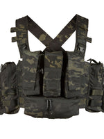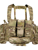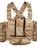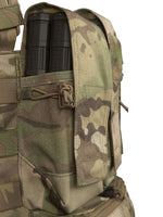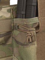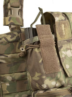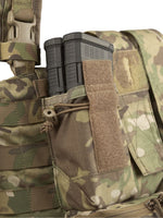 The Peacekeeper MK5 (PK5) is the latest iteration in the Platatac family of of Chicom-compatible fixed rigs. Like its predecessor, it boasts a large carrying capacity, with three double velcro closure magazine pouches central to the rig designed primarily to hold 2 x M4 magazines each. The magazine pouches have adjustable/removable lids to allow larger magazines, such as AK47 mags to be carried or allow easier access to mags by removing the flaps all together. They can also accommodate a pistol, black means (Baofeng) radio or a smoke grenade if required. Bungee retention around the mag pouches provides additional security for stowed items.