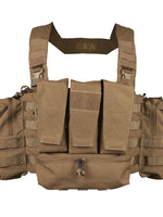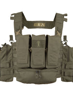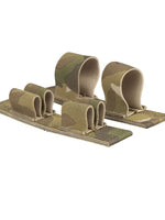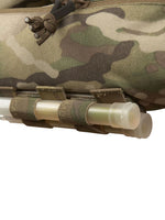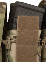 A PALS field either side of the mag pouches allows the user to attach additional magazine, grenade, radio, or first aid pouches. Below the magazine pouches is a long zippered pouch for other mission essentials, such as additional first aid items or dems gear. Sewn to the bottom of this pouch are webbing loops to attach either of two elastic inserts (included), one holds SOF or CAT TQ and the other can hold two 4" or 6" cyalume, having either one readily accessible when required.